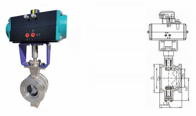 不銹鋼氣動V型對夾球閥外形結(jié)構(gòu)圖: