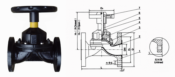 部件列表:1、閥體 2、閥體襯里 3、隔膜 4、閥瓣 5、閥桿 6閥蓋 7、手輪