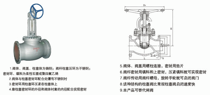 大口徑柱塞閥(活塞閥)是由閥體、閥蓋、閥桿、柱塞、導(dǎo)向、密封環(huán)、手輪等零件組成(如圖)。當手輪旋轉(zhuǎn)時,通過閥桿帶動柱塞在導(dǎo)向套中上、下往復(fù)運動,使柱塞端部斜錐面與閥座錐面完成閥門的開啟與關(guān)閉功能。 在閥門中柱塞與密封環(huán)間采用過盈配合,通過調(diào)節(jié)中法蘭螺栓預(yù)緊力,使密封環(huán)壓縮所產(chǎn)生的側(cè)向力與閥體中孔面柱塞外圓密封,從而保證了閥門的密封性。杜絕了內(nèi)泄漏。 由于密封環(huán)采用回彈性強、耐磨性高的無毒新型密封材料,所以密封可靠、經(jīng)久耐用,從而提高了閥門的使用壽命。 本閥門結(jié)合柱塞閥的無泄漏優(yōu)點和截止閥啟閉快的特點,成為一種結(jié)構(gòu)新穎、用途廣泛的新產(chǎn)品。其優(yōu)越性遠勝于普通截止閥。