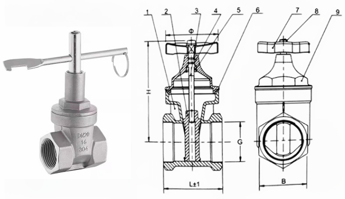 不銹鋼絲口帶鎖閘閥外形結構圖: