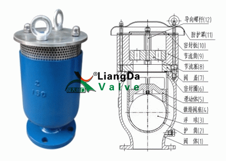 空氣閥有兩個(gè)圓柱形浮筒:大浮筒和小浮筒,分別負(fù)責(zé)低壓進(jìn)排氣與高壓微量排氣。小浮筒安裝在大浮筒的上方,且兩個(gè)浮筒均在主閥體內(nèi)空氣閥帶有緩沖盤片,確保平緩排氣,防止出現(xiàn)"氣堵"破壞的情況。緩沖片在經(jīng)歷高速排氣時(shí)所通過的面積以及小孔的數(shù)量可做調(diào)整。