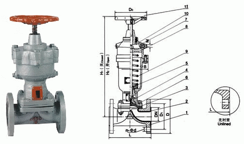 8、隔膜閥的閥體內(nèi)腔表面復(fù)有可供選擇的多種橡膠、氟塑料等。因此具有耐腐蝕的特點(diǎn)。
