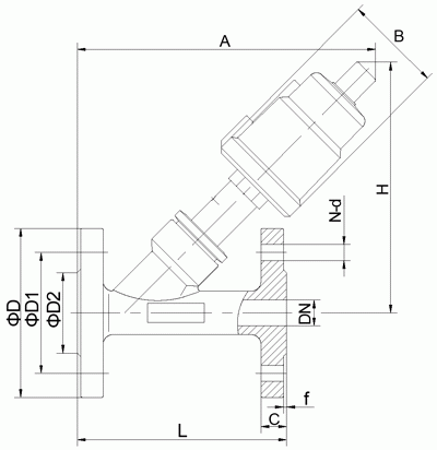 法蘭氣動角座閥外形結(jié)構(gòu)圖: