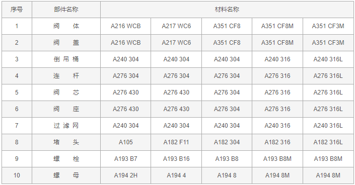 982、882倒吊桶式蒸汽疏水閥零件材料: