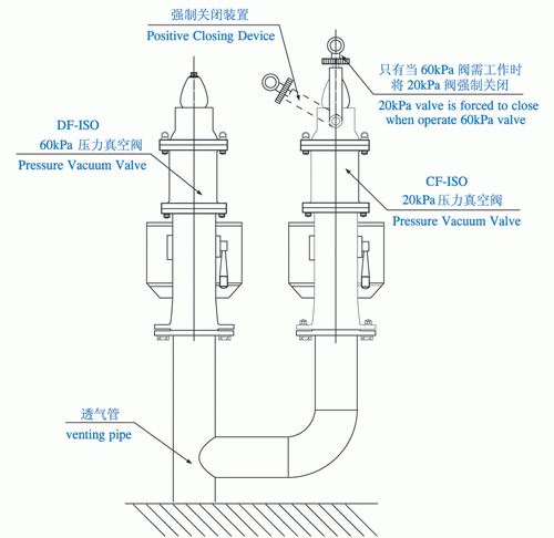 一般用于裝載環(huán)氧丙烷類的液貨船舶,均能裝載普通化學(xué)品。因此,每個液貨倉必須裝有CF-ISO型和DF-ISO型高速透氣閥各一個,其安裝方法如下圖。當船舶裝載環(huán)氧丙烷類貨品時,只要將CF-ISO型壓力閥強制關(guān)閉即可,反之,如裝載普通化學(xué)品時,只要開啟強制關(guān)閉裝置。裝卸貨前,應(yīng)按運作要求進行閥門升降檢查。檢查時,必須同時檢查兩個閥的壓力閥和真空閥,因為該使用方法中的兩個閥門具有相互保險的作用,可以最大限度地防止貨艙超壓和失壓。依據(jù)DF型壓力/真空閥的流量范圍,可以安裝在DN125(含DN125)以下的透氣管上,連接法蘭由用戶任選。