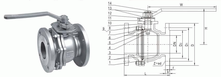 德標(biāo)法蘭球閥外形結(jié)構(gòu)圖: