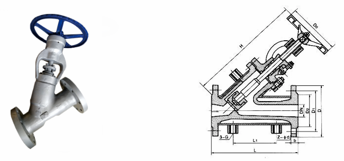 高壓法蘭Y型截止閥外形結(jié)構(gòu)圖: