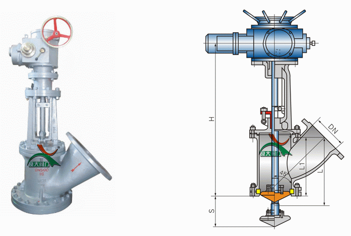 電動平底放料閥有Y型及角式兩種結(jié)構(gòu)形式,根據(jù)實際工況的需要,放料口的形式設(shè)計有帶管接及平底兩種,閥體內(nèi)腔裝有耐沖刷、耐腐蝕的護(hù)板,在開啟閥門瞬間,可以保護(hù)閥體不被介質(zhì)沖刷、腐蝕,并對其整體進(jìn)行化學(xué)鍍Ni.P處理,使表面硬度達(dá)到HRC60—62,有耐磨、耐腐蝕的。閥座密封面與閥瓣密封面均堆焊有司太立硬質(zhì)合金,密封副采用線密封,保證密封,密封的可靠性,并可防止結(jié)疤。閥門設(shè)有防轉(zhuǎn)機(jī)構(gòu),保證閥桿在開啟和關(guān)閉時只做直線運(yùn)動,不做回轉(zhuǎn)運(yùn)動。該閥主要由閥體、閥瓣、密封圈、閥桿、支架、閥壓蓋、手輪、法蘭、螺母、定位螺釘?shù)攘慵M成。手輪順時針旋轉(zhuǎn),閥門關(guān)閉,閥桿向上移動,此閥為上展式。手輪順時針旋轉(zhuǎn),閥門關(guān)閉,閥桿向下轉(zhuǎn)動,此閥為下展式。閥門驅(qū)動方式有:手動、電動、氣動、齒輪傳動。
