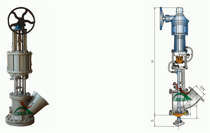 氣動(dòng)平底放料閥有Y型及角式兩種結(jié)構(gòu)形式,根據(jù)實(shí)際工況的需要,放料口的形式設(shè)計(jì)有帶管接及平底兩種,閥體內(nèi)腔裝有耐沖刷、耐腐蝕的護(hù)板,在開啟閥門瞬間,可以保護(hù)閥體不被介質(zhì)沖刷、腐蝕,并對(duì)其整體進(jìn)行化學(xué)鍍Ni.P處理,使表面硬度達(dá)到HRC60—62,有耐磨、耐腐蝕的。閥座密封面與閥瓣密封面均堆焊有司太立硬質(zhì)合金,密封副采用線密封,保證密封,密封的可靠性,并可防止結(jié)疤。閥門設(shè)有防轉(zhuǎn)機(jī)構(gòu),保證閥桿在開啟和關(guān)閉時(shí)只做直線運(yùn)動(dòng),不做回轉(zhuǎn)運(yùn)動(dòng)。該閥主要由閥體、閥瓣、密封圈、閥桿、支架、閥壓蓋、手輪、法蘭、螺母、定位螺釘?shù)攘慵M成。