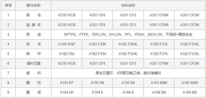 美標(biāo)法蘭球閥零件材料:
